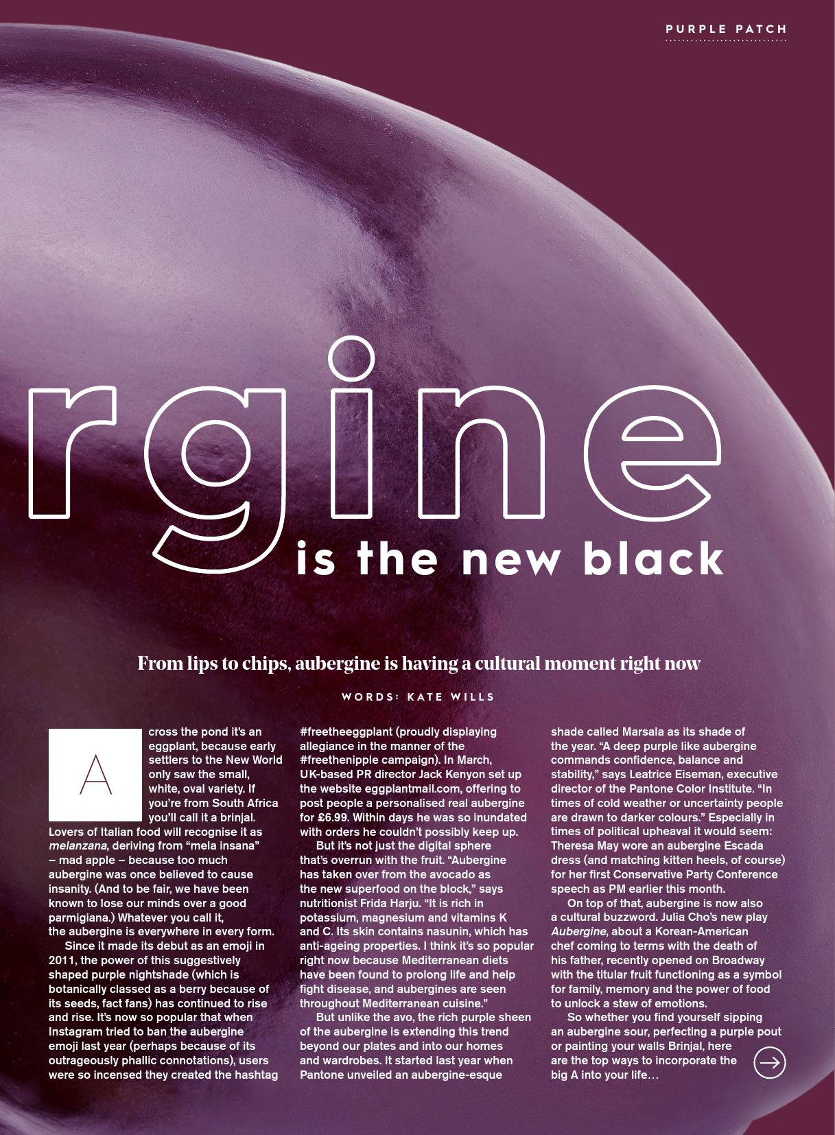 But unlike the avo, the rich purple sheen of the aubergine is extending this trend beyond our plates and into our homes and wardrobes. It started last year when Pantone unveiled an aubergine-esque shade called Marsala as its shade of the year. “A deep purple like aubergine commands confidence, balance and stability,” says Leatrice Eiseman, executive director of the Pantone Color Institute. “In times of cold weather or uncertainty people are drawn to darker colours.” Especially in times of political upheaval it would seem: Theresa May wore an aubergine Escada dress (and matching kitten heels, of course) for her first Conservative Party Conference speech as PM earlier this month.