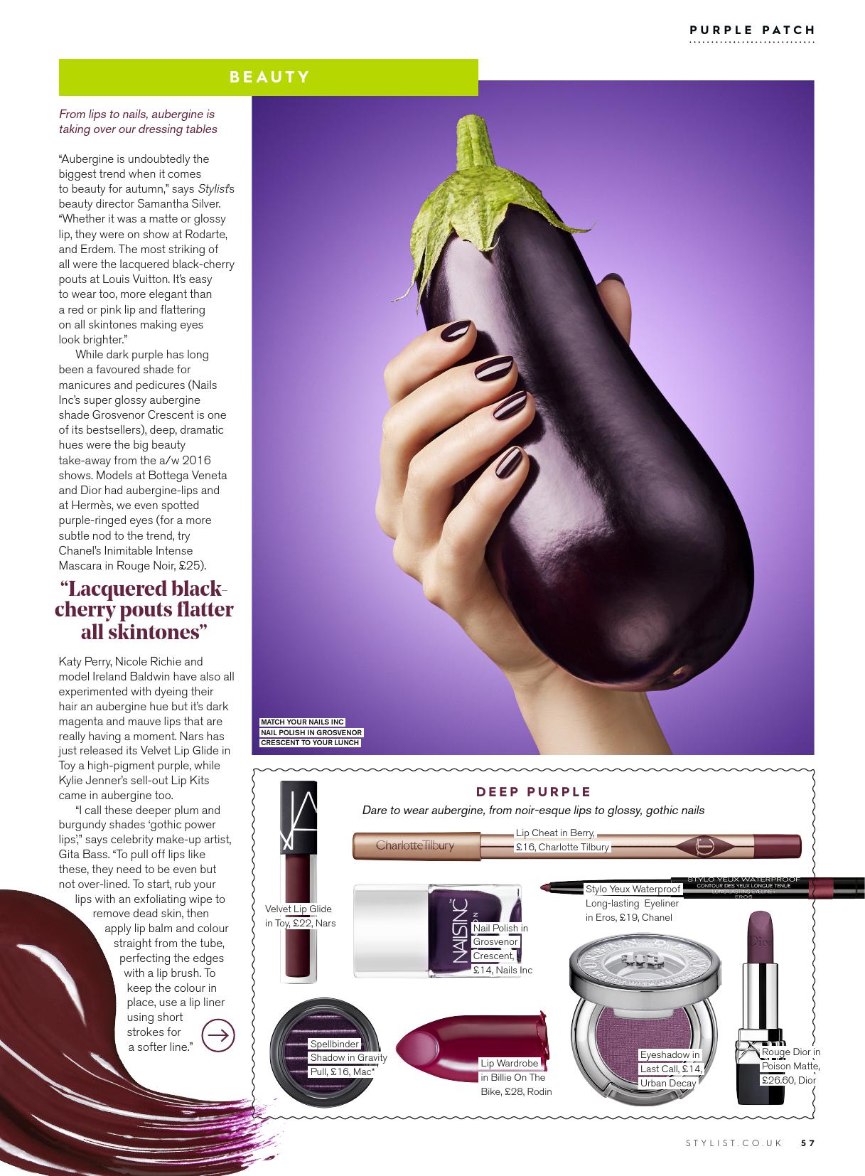 Aubergine is undoubtedly the biggest trend when it comes to beauty for autumn,” says Stylist’s beauty director Samantha Silver. “Whether it was a matte or glossy lip, they were on show at Rodarte, and Erdem. The most striking of all were the lacquered black-cherry pouts at Louis Vuitton. It’s easy to wear too, more elegant than a red or pink lip and flattering on all skintones making eyes look brighter.”