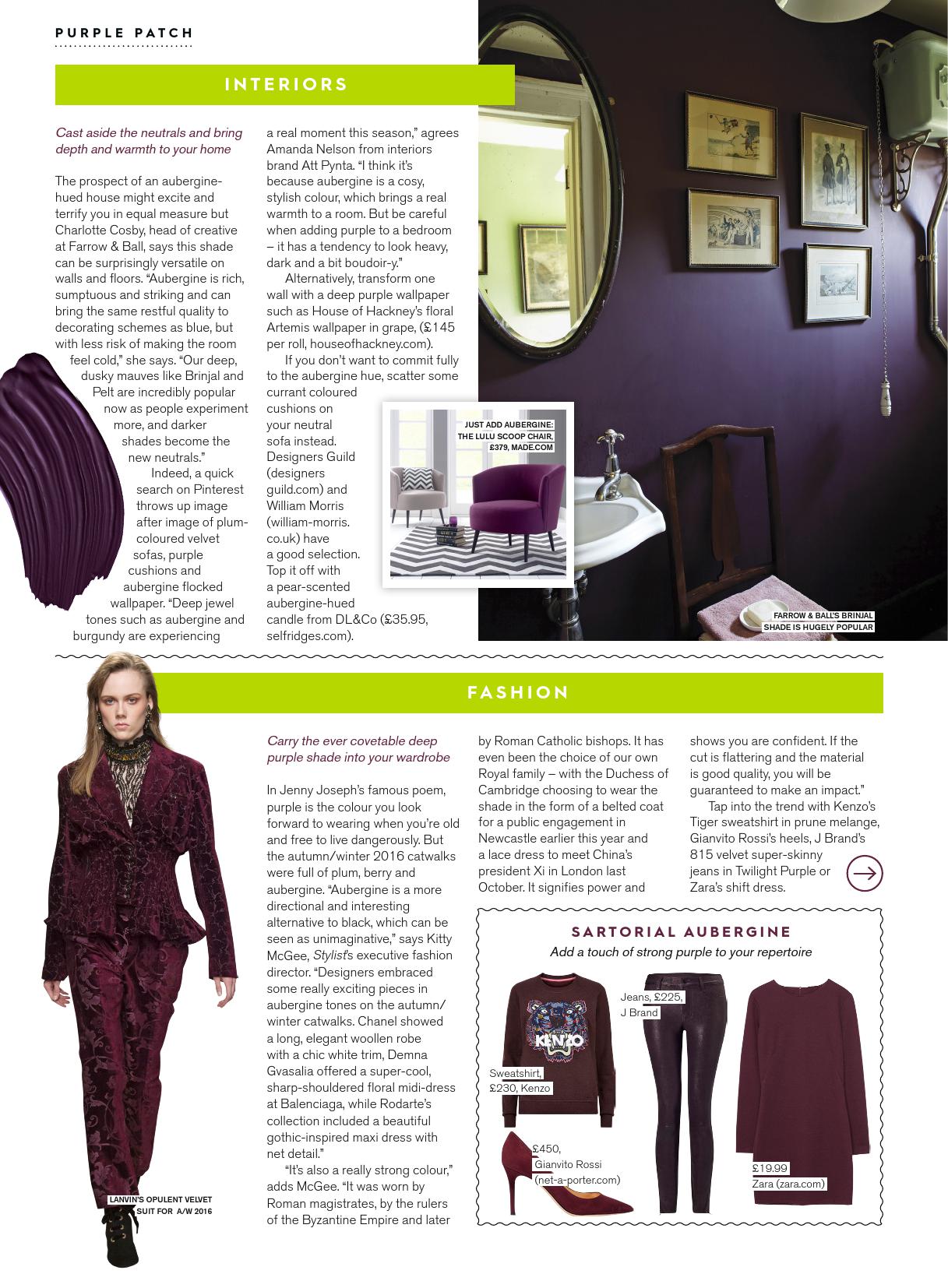 In Jenny Joseph’s famous poem, purple is the colour you look forward to wearing when you’re old and free to live dangerously. But the autumn/winter 2016 catwalks were full of plum, berry and aubergine. “Aubergine is a more directional and interesting alternative to black, which can be seen as unimaginative,” says Kitty McGee, Stylist’s executive fashion director. “Designers embraced some really exciting pieces in aubergine tones on the autumn/ winter catwalks. Chanel showed a long, elegant woollen robe with a chic white trim, Demna Gvasalia offered a super-cool, sharp-shouldered floral midi-dress at Balenciaga, while Rodarte’s collection included a beautiful gothic-inspired maxi dress with net detail.”