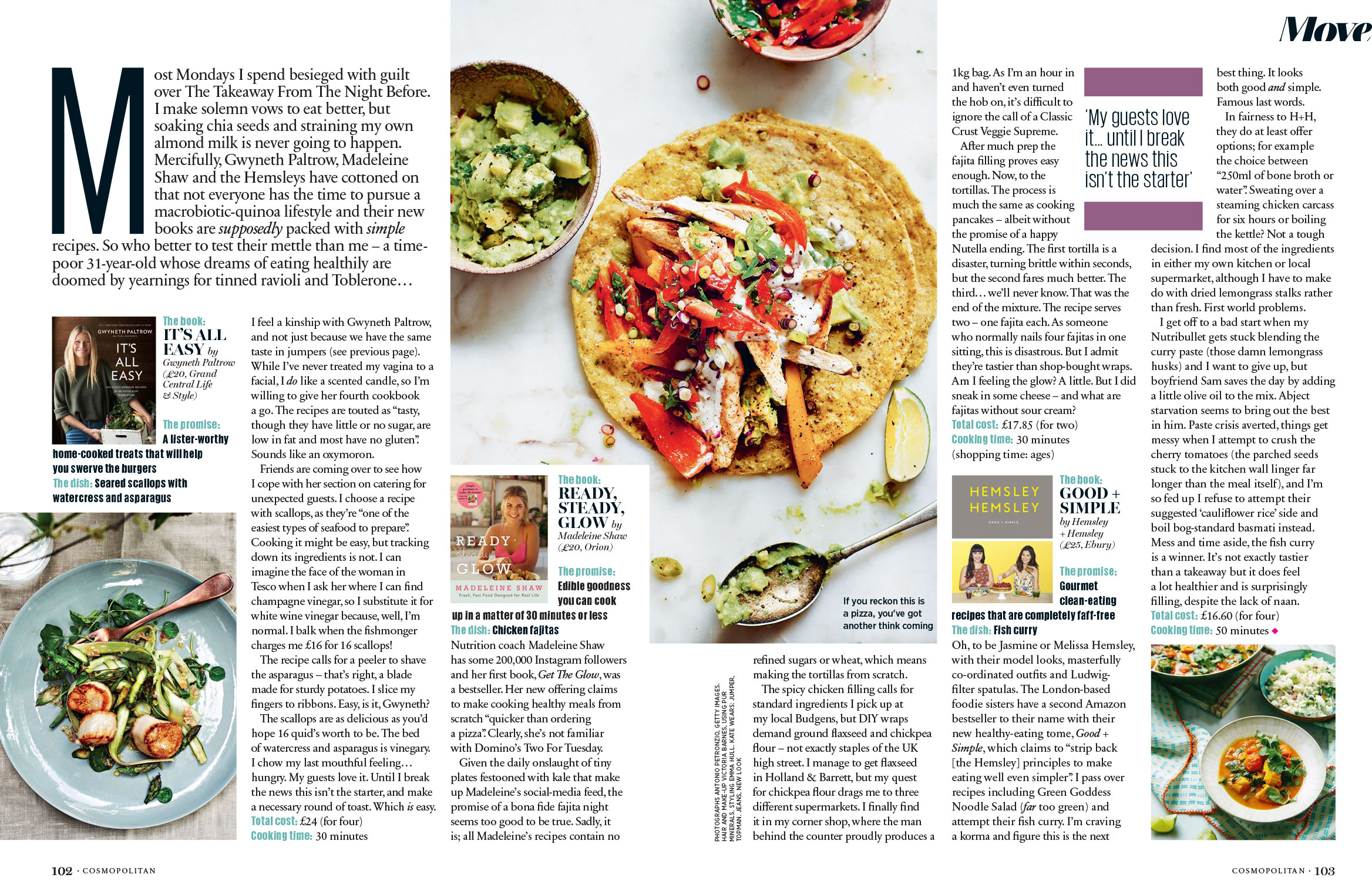 Like most people I aim to eat healthily – I even have a slightly sticky Spiralizer lurking in the back of my cupboard – but soaking my own chia seeds on a Saturday night is just never going to happen. Thankfully it seems that the queens of eating clean have cottoned on to the fact not everyone has their macrobiotic quinoa lifestyle, and their new books promise easy, simple recipes, made with supermarket ingredients, in less than 30 minutes flat. Will a week of cooking like Gwyneth and co. turn me into a glossy-haired, glowy-skinned goddess? Or will I be left ravenous and ready to commit murder to get my hands on a Nandos? There’s only one way to find out…