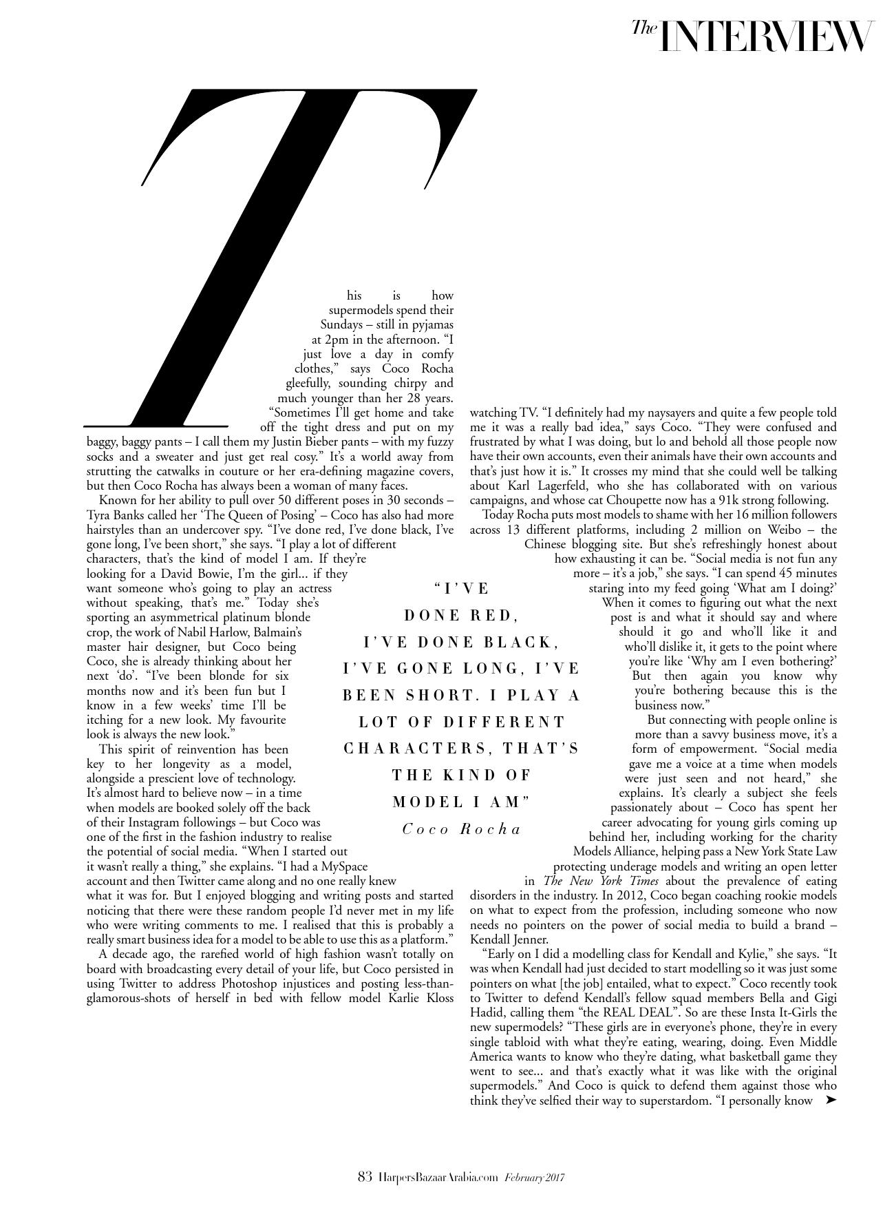 This is how supermodels spend their Sundays – still in pyjamas at 2pm in the afternoon. “I just love a day in comfy clothes,” says Coco Rocha gleefully, sounding chirpy and much younger than her 28 years. “Sometimes I’ll get home and take off the tight dress and put on my baggy, baggy pants – I call them my Justin Bieber pants – with my fuzzy socks and a sweater and just get real cosy.” It’s a world away from strutting the catwalks in couture or her era-defining magazine covers, but then Coco Rocha has always been a woman of many faces.
