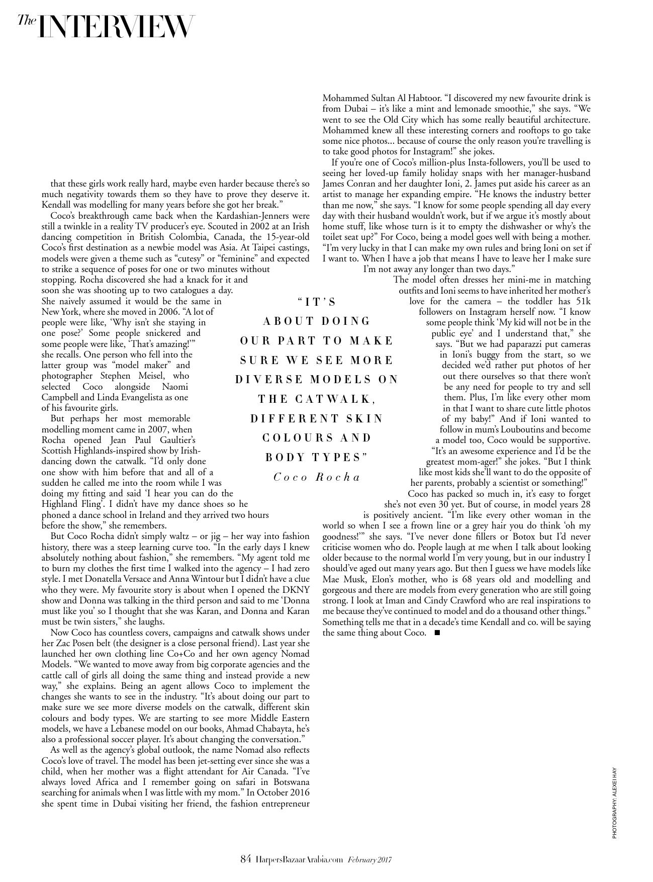 Now Rocha has countless covers, campaigns and catwalk shows under her Zac Posen belt (the designer is a close personal friend). Last year she launched her own clothing line Co+Co and her own agency NOMAD models. “We wanted to move away from big corporate agencies and the cattle call of girls all doing the same thing and instead provide a new way,” she explains. Being an agent allows Rocha to implement the changes she wants to see in the industry. “It’s about doing our part to make sure we see more diverse models on the catwalk, different skin colours and body types. We are starting to see more Middle Eastern models, we have a Lebanese model on our books, Ahmad Chabayta, he’s also a professional soccer player. It’s about changing the conversation.”