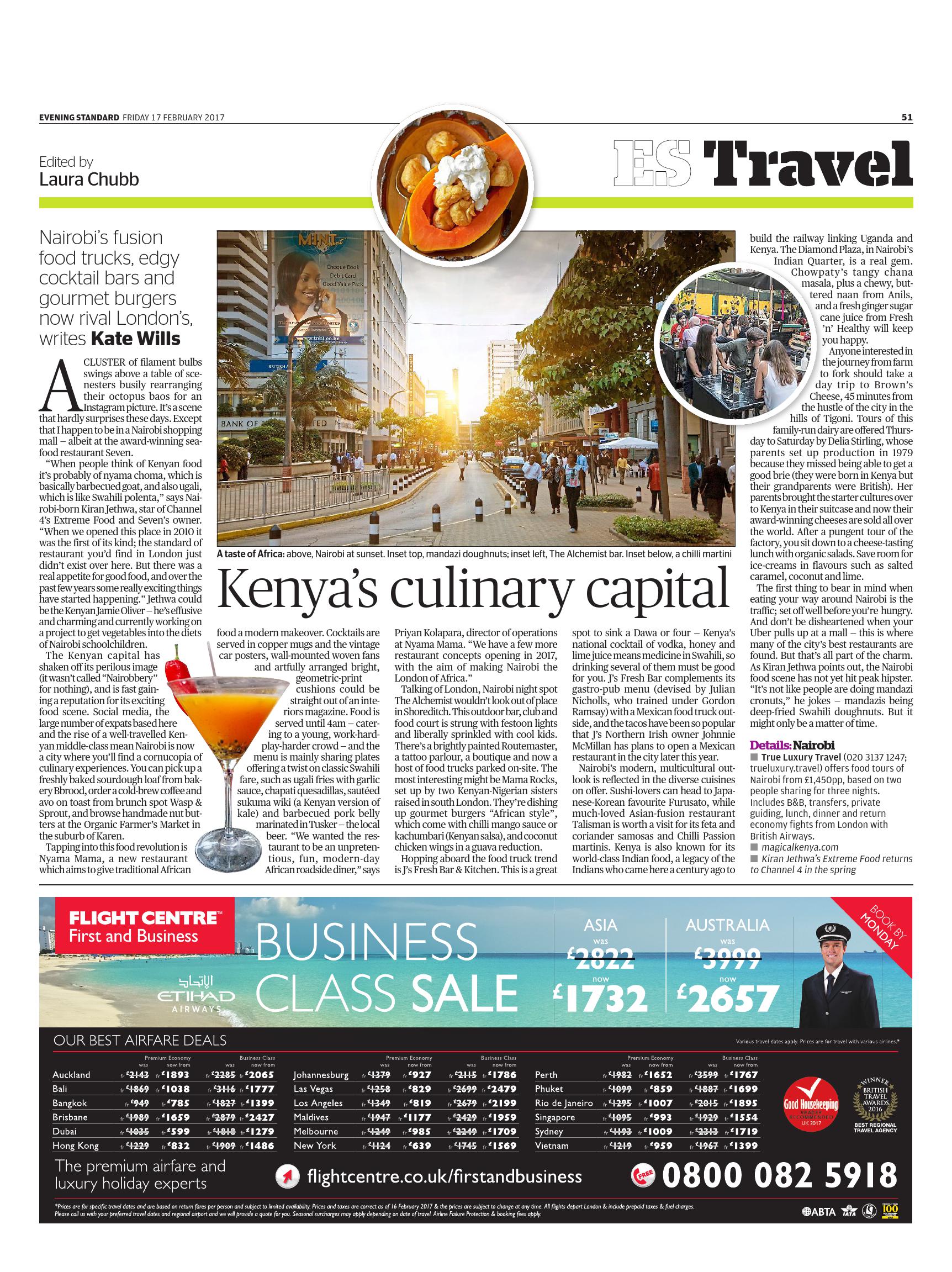 True Luxury Travel (020 3137 1247; trueluxury.travel) offers food tours of Nairobi from £1,450pp, based on two people sharing for three nights. Includes B&B, transfers, private guiding, lunch, dinner and return economy fights from London with British Airways.