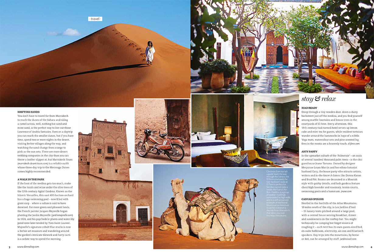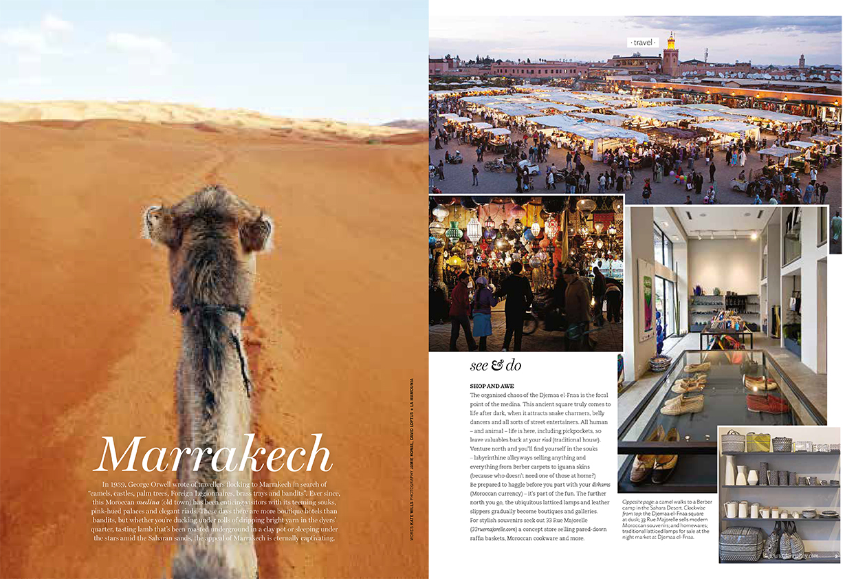 In 1939, George Orwell wrote of travellers flocking to Marrakech in search of “camels, castles, palm trees, Foreign Legionnaires, brass trays and bandits”. Ever since, this Moroccan medina town has been enticing visitors with its teeming souks, pink-hued palaces and elegant riads. These days there are more boutique hotels than bandits, but whether you’re ducking under rolls of dripping bright yarn in the dyers’ quarter, tasting lamb that’s been roasted underground in a clay pot or sleeping under the stars amid the Saharan sands, the appeal of Marrakech is eternally captivating.
