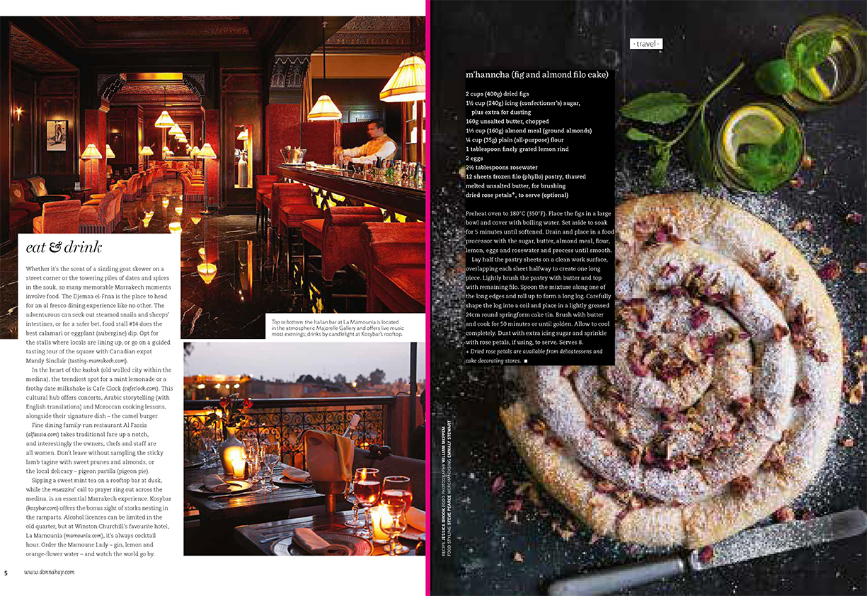 Whether it’s the scent of a sizzling goat skewer on a street corner or the towering piles of dates and spices in the souk, so many memorable Marrakech moments involve food. The Djemma El Fnaa is the place to head for an al fresco dining experience like no other. The adventurous can seek out steamed snails and sheeps’ intestines, or for a safer bet, stand 14 does the best calamari and aubergine paste. Opt for the stalls where locals are lining up, or Tasting Marrakech.