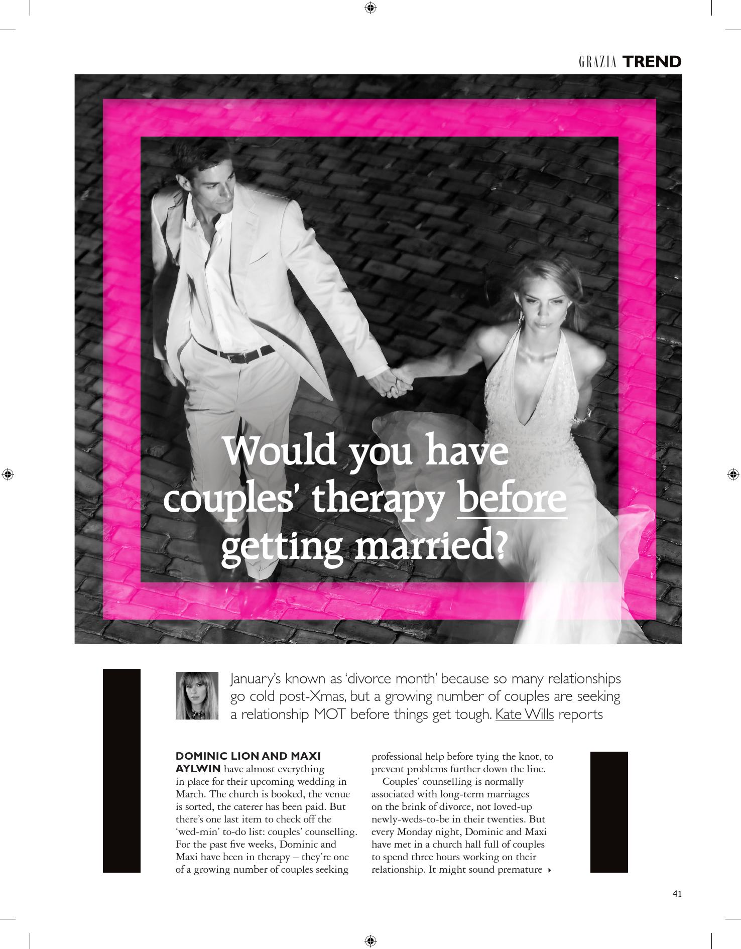 Couples counselling is normally associated with long-term marriages on the brink of divorce, not loved-up newly-weds-to-be in their twenties. But every Monday night, Dominic and Maxi have met in a church hall full of couples to spend three hours working on their relationship. It might sound premature, but according to a survey published in the Journal of Family Psychology, couples with premarital education reported higher levels of marital satisfaction and were 30% less likely to get divorced.*