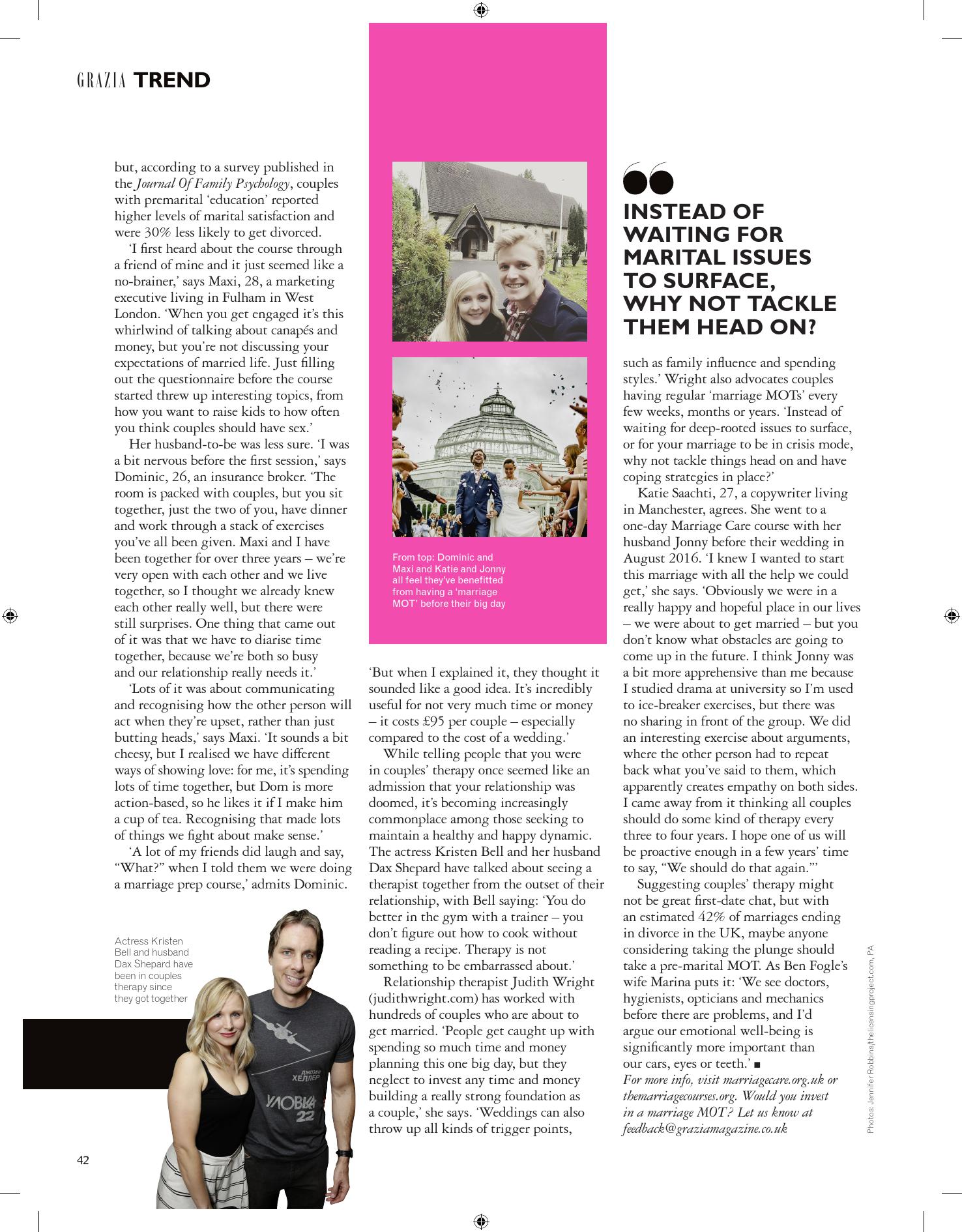Katie Saachti, 27, a copywriter living in Manchester, agrees. She went to a one-day Marriage Care course (marriagecare.org.uk) with her husband Jonny before their wedding in August 2016. “I knew I wanted to start this marriage with all the help we could get,” she says. “Obviously we were in a really happy and hopeful place in our lives – we were about to get married – but you don’t know what obstacles are going to come up in the future. I think Jonny was a bit more apprehensive than me because I did Drama at university so I’m used to ice-breaker exercises, but there was no sharing in front of the group or airing dirty linen in public. We did a really interesting exercise about arguments, where the other person was forced to repeat back what you’ve said to them, which apparently forces empathy on both sides. I came away from it thinking all couples should do some kind of therapy every three to four years. I hope one of us will be proactive enough in a few years to say ‘We should do that again’.”