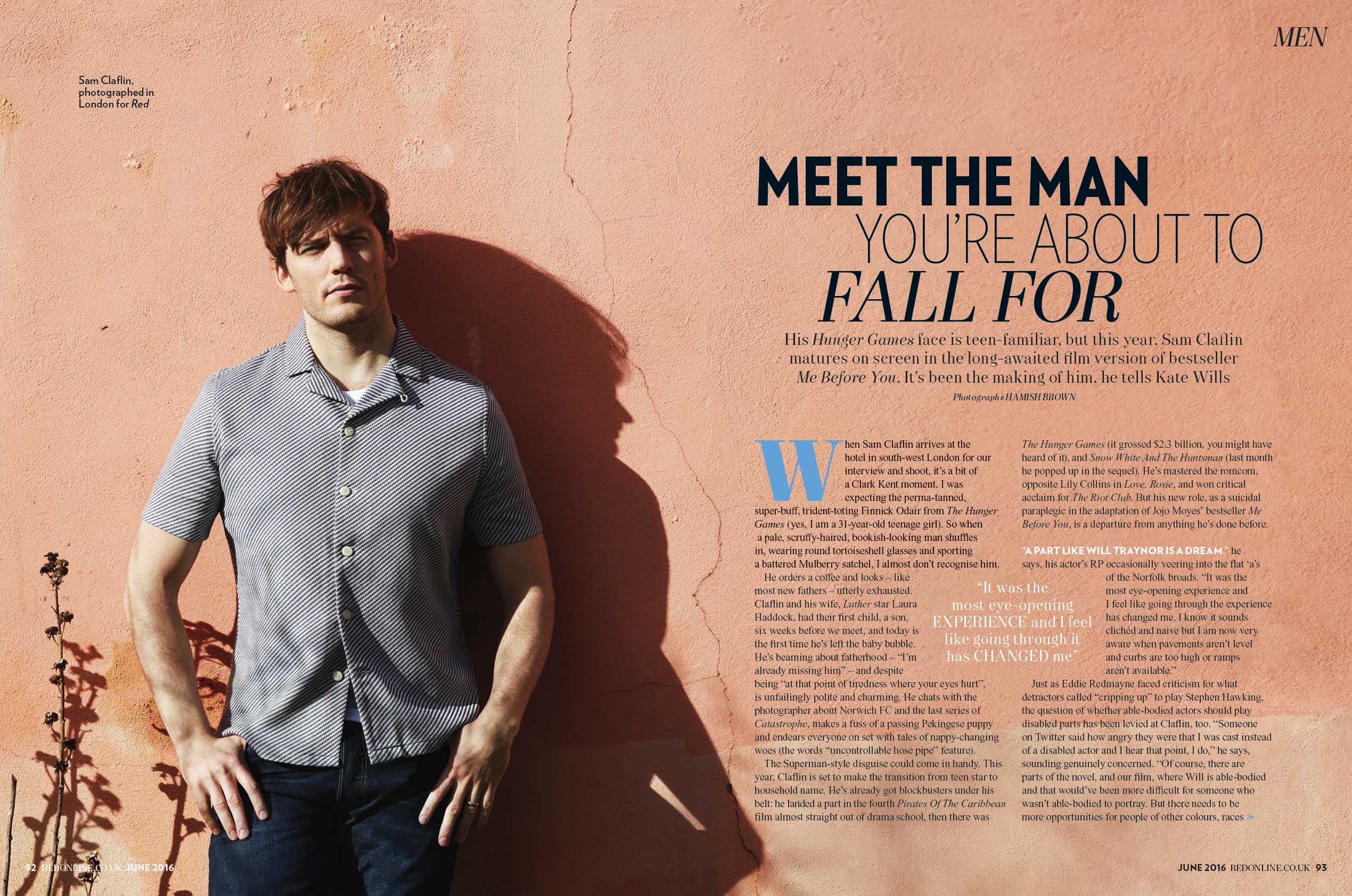 He’s best known as the trident-toting hunk in The Hunger Games, but for his latest role Sam Claflin shed more than three stone to play a suicidal paraplegic. He talks to Kate Wills about body shaming, Instagram fame and his most important role to date — being a dad.