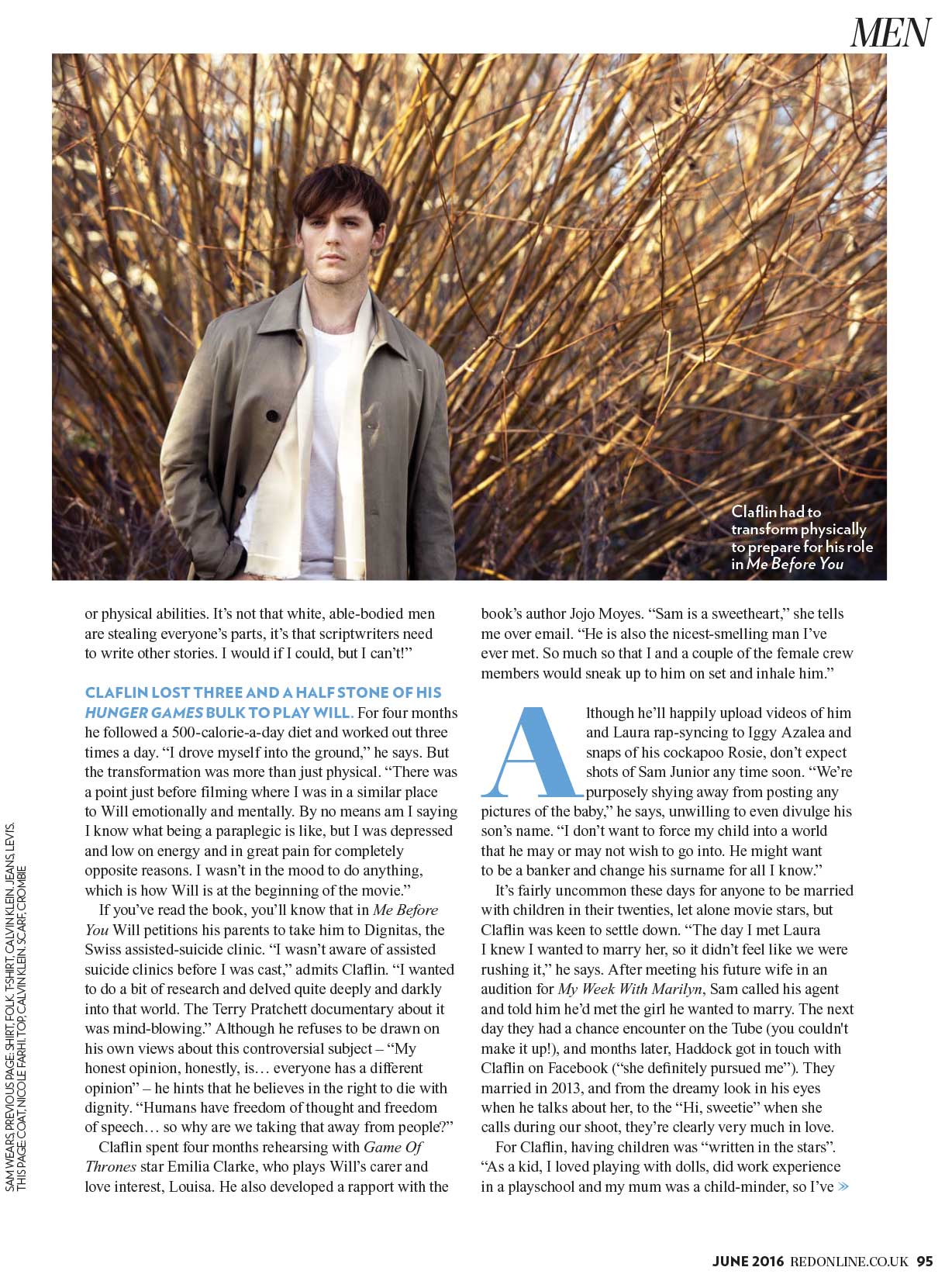 Claflin spent four months rehearsing with <Game of Thrones> star Emilia Clarke, who plays Will’s carer and love interest Louisa. He also developed a rapport with the book’s author JoJo Moyes. “Sam is a sweetheart,” she tells RED via email. “He is also the nicest smelling man I’ve ever met. So much so that I and a couple of the female crew members would periodically sneak up to him on set and just inhale him.” Claflin recently posted a photo to Instagram of himself reading Moyes’ book in a pair of its famous “bumblebee tights”.