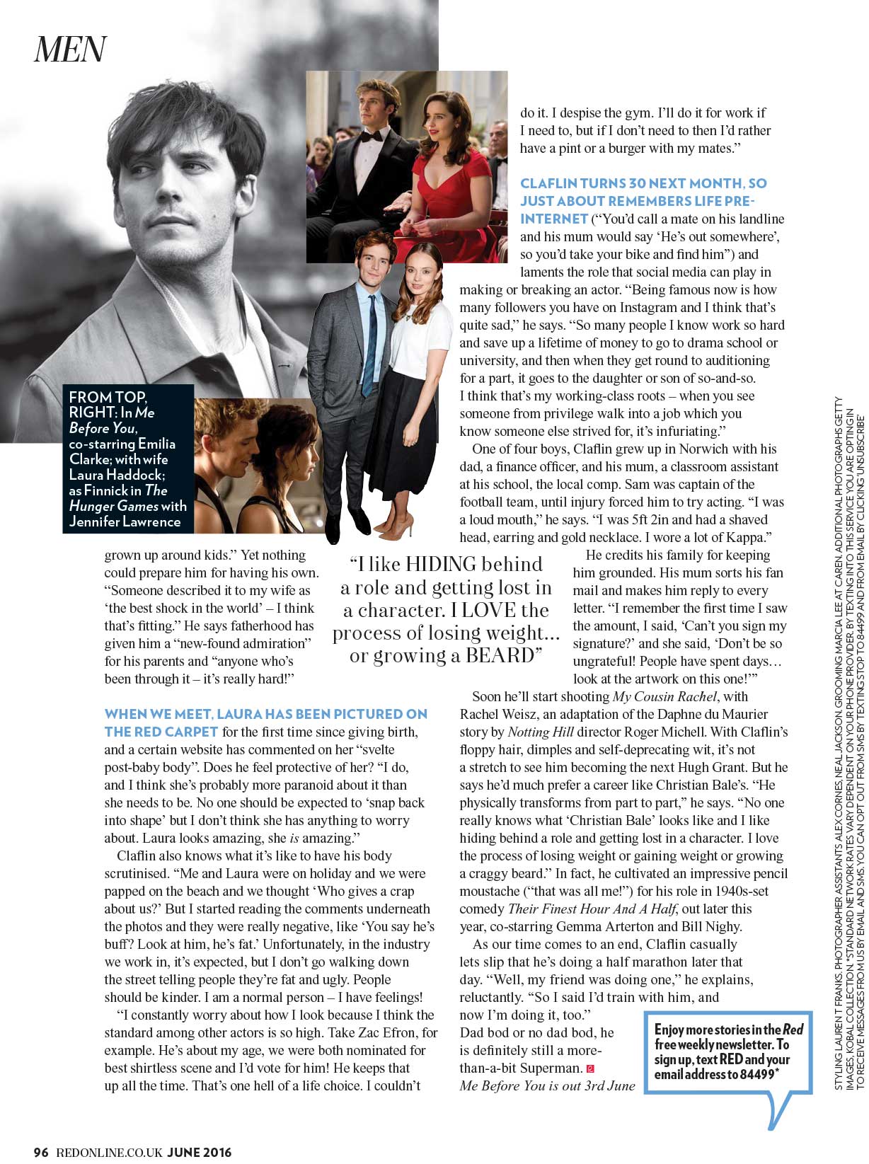 It’s fairly uncommon these days for anyone to be married with children in their twenties, let alone Hollywood movie stars, but Claflin was keen to settle down. “The day I met Laura I knew I wanted to marry her so it didn’t feel like we were rushing it,” he says. After meeting Haddock in an audition for My Week With Marilyn, Sam called his agent and told him he’d met the girl he wanted to marry. The next day they had a chance encounter on an early-morning tube, and months later Haddock got in touch with Claflin on Facebook (“she definitely pursued me”). They married in 2013, and from the dreamy look in his eyes when he talks about her, to the “hi sweetie” when she calls during our shoot, they’re clearly very much in love.