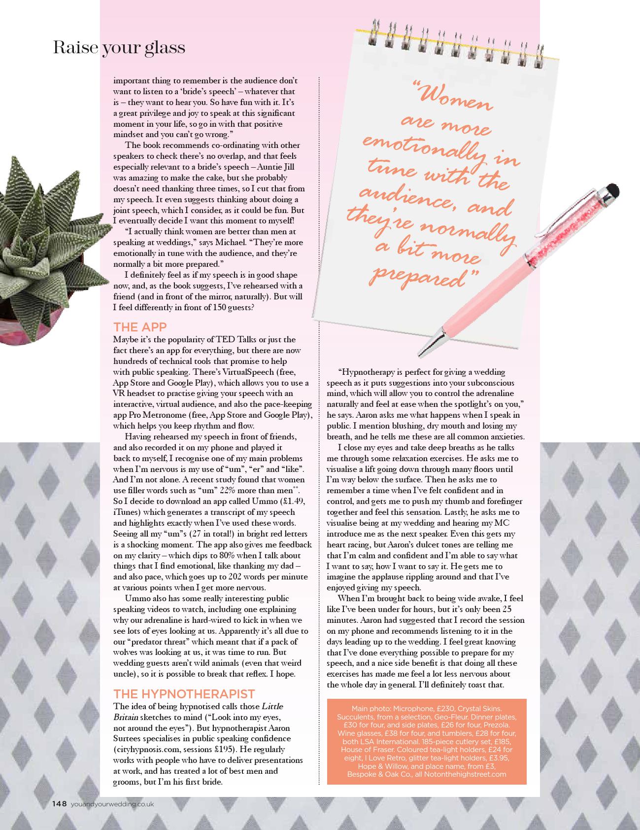 “Hypnotherapy is perfect for giving a wedding speech as it puts suggestions into your subconscious mind which will allow you to control the adrenaline naturally and feel at ease when the spotlight’s on you,” he says. I feel a little apprehensive as I lie back on a big black leather chair, and Surtees asks me what happens when I speak in public. I mention blushing, dry mouth and losing  my breath and he tells me these are all common anxieties.