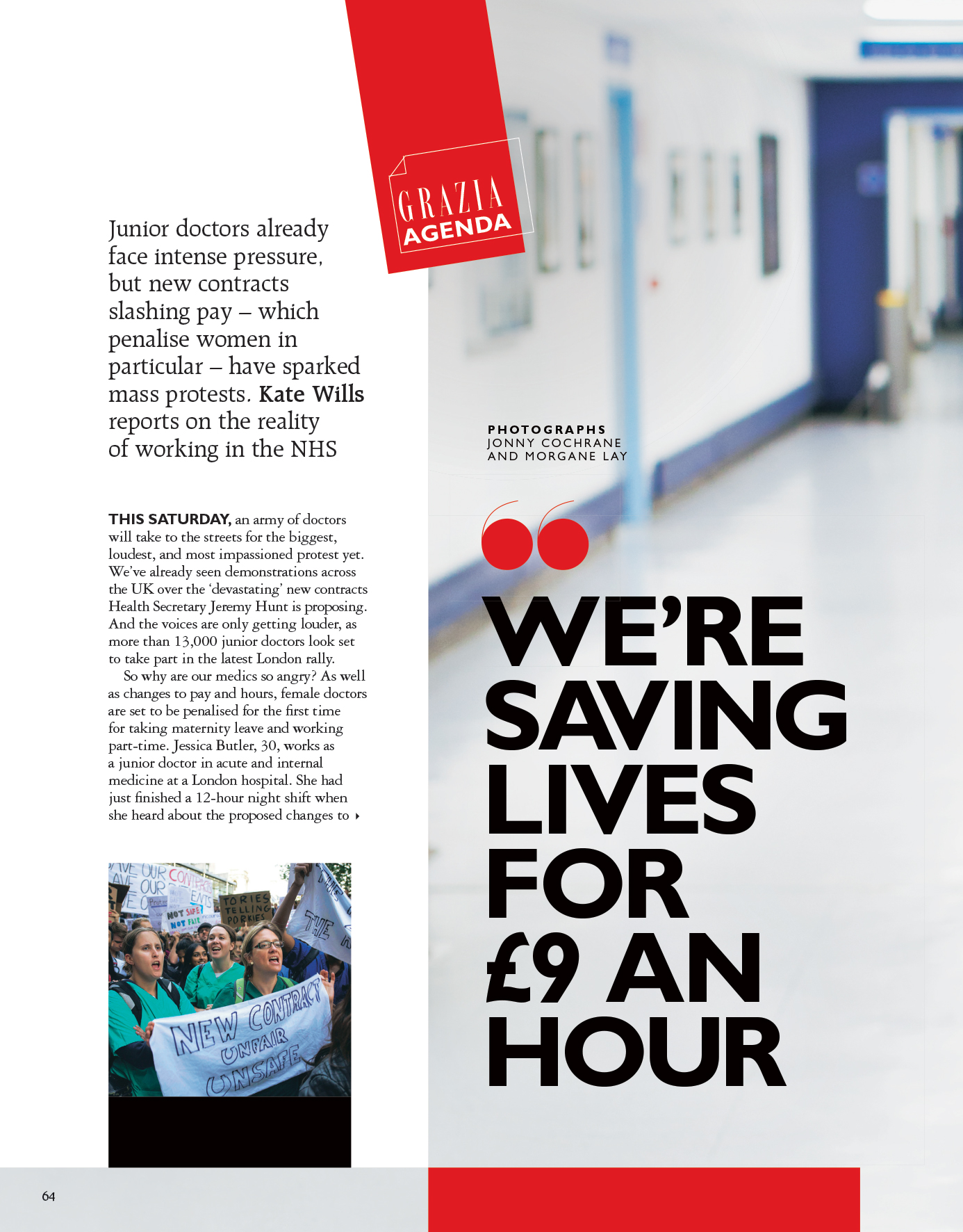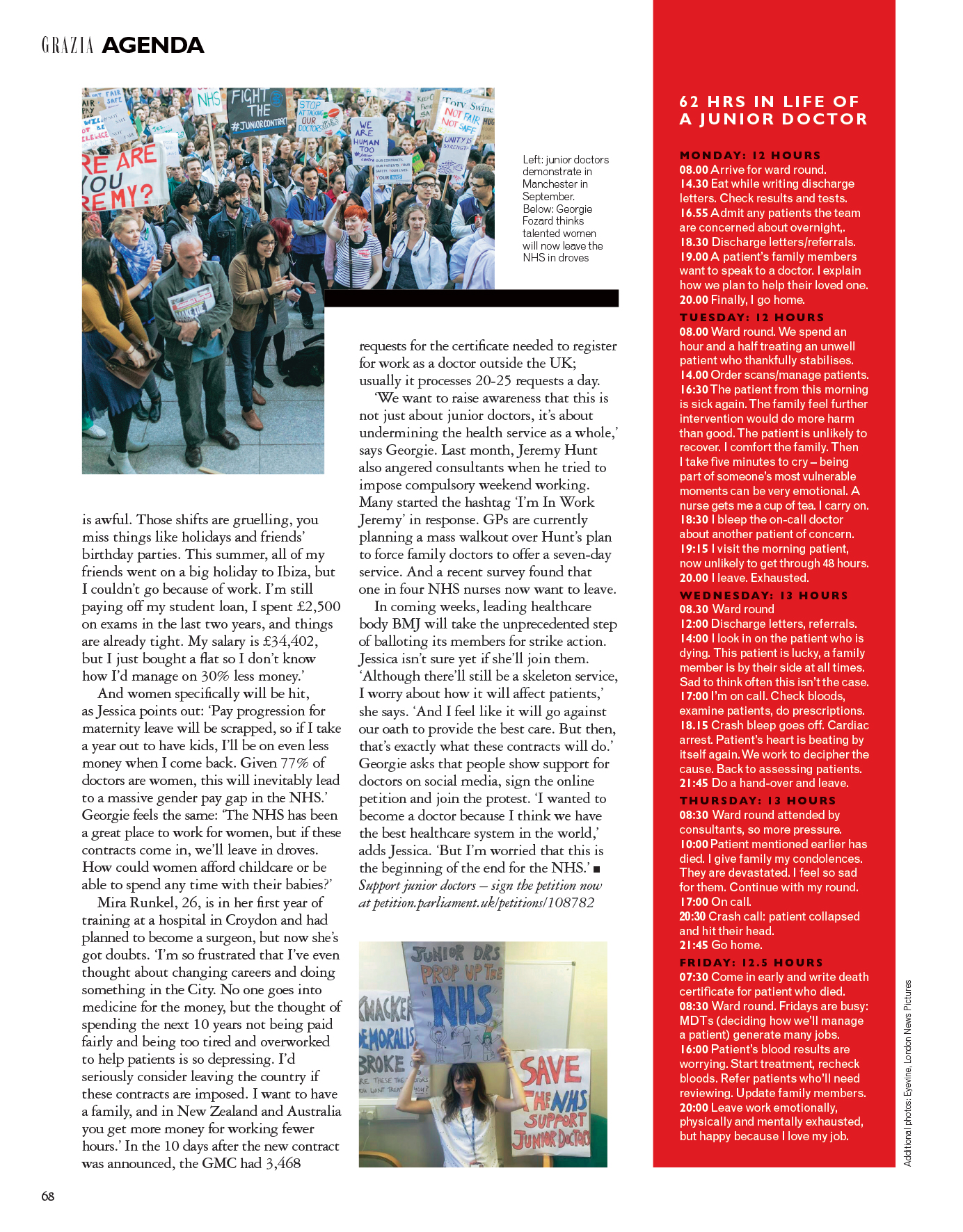 And women specifically will be hit, as Jessica points out: ‘Pay progression for maternity leave will be scrapped, so if I take a year out to have kids I’ll be on even less money when I come back. Given 77% of doctors are women, this will inevitably lead to a massive gender pay gap in the NHS.’ Georgie feels the same: ‘The NHS has been a great place to work for women, but if these contracts come in, we’ll leave in droves. How could women afford childcare or be able to spend any time with their babies?’