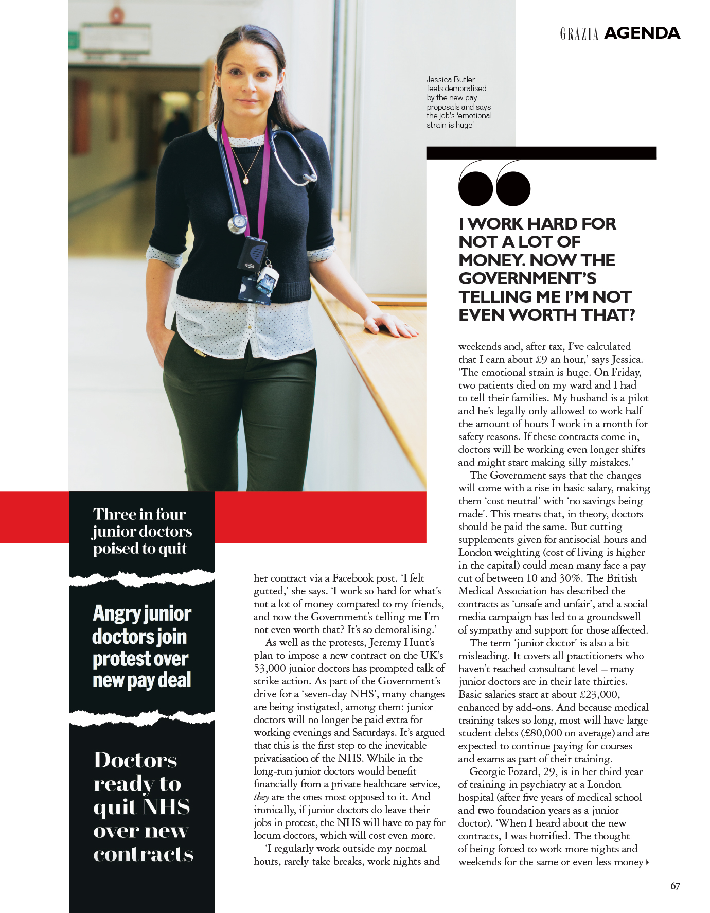So why are our medics so angry? As well as changes to pay and hours, female doctors are set to be penalised for the first time for taking maternity leave and working part-time.Jessica Butler, 30, works as a junior doctor in acute and internal medicine at a London hospital. She had just got off a 12-hour night shift when she heard about the proposed changes to her contract via a Facebook post. ‘I felt gutted,’ she says. ‘I work so hard, for what’s not a lot of money compared to my friends, and now the government’s telling me I’m not even worth that? It was totally demoralising.’